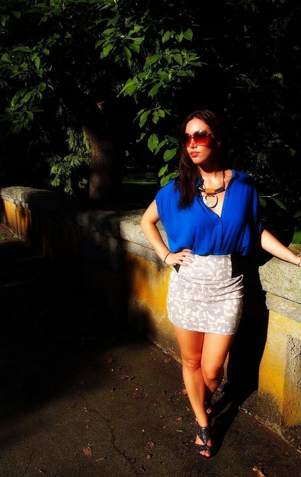 Jeffrey Campbell heels, Urban Outfitters skirt, Zara shirt, H&M necklace, Club Monaco clutch, bracelet from Mexico, H&M sunglasses