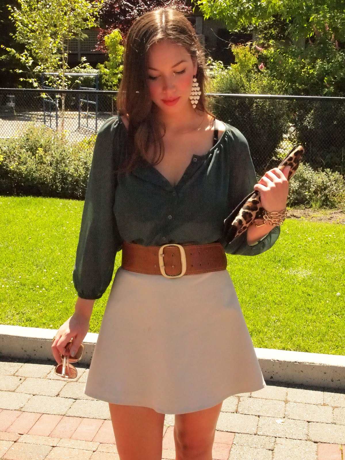 I absolutely love everything about this outfit. The green blouse is perfectly paired with the cream skirt, and the leopard is a great bold accent! You have amazing style.