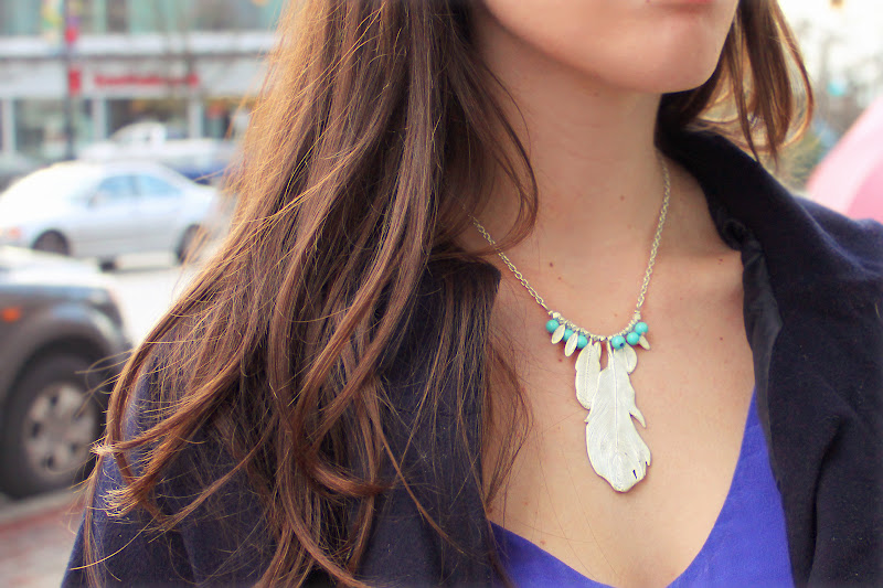Being as busy as I have been this past year, I figured out a colour palette of warm tones that worked seamlessly together in order to make dressing in the near-unconscious hours of the early morning easier. Though it’s made my mornings run a bit more smoothly, I have really missed all of the blues and greens that I used to wear more. Since spring finally feels like it’s on its way, I broke out a couple of my favourite ocean-toned hues yesterday and made friendly with them again. It was also the perfect opportunity to showcase my new turquoise and silver necklace from Shoppalu – so in love with it!