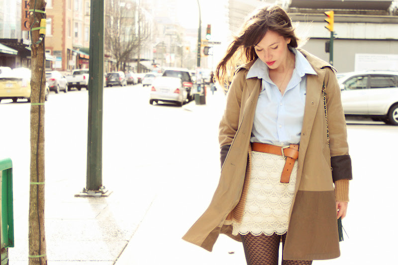 Love the colour of your boyfriend's oxford shirt. So classic and paired lovely against the white of your scalloped skirt (which is also great in itself). The whole outfit evokes that classic enduring style with the khaki colours mixed in, yet still modern with the tights, the belt and the updated trench.