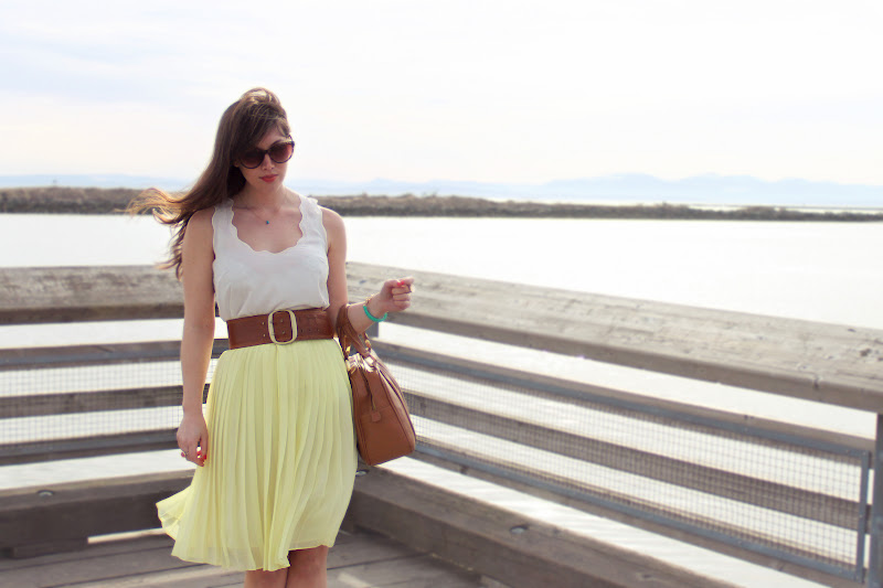 Getting old! Uh-oh! Luckily you look stunning as usual 🙂 I love the scalloped edges of the tank and the lemony color of the skirt. Perfect spring and summer attire. Keep day over the next few days!