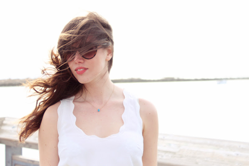 Love the soft colours of the whole palette, it allllmost tricks me into thinking summer is right around the corner. And then a giant gust of wind nearly blows me over and I'm reminded that we live in Vancouver. Regardless, the scalloping on the neck is such a great detail of the shirt that adds that femininity. The cat eye sunglasses are great too by the way!