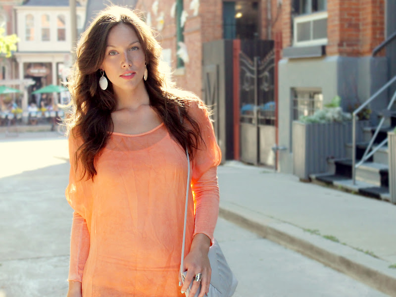 This is the second to last out of my lookbook posts! This orange silk top from Shoppalu (which was on sale at STYLE/STALK but appears to be sold out – don’t worry though, tons of other great blouses still on sale!) was such a perfect piece for the point in the summer that I shot it. It had been absolutely steamy hot outside and every day was basically a challenge to figure out how to dress in a way that wouldn’t melt you down by noon. This top’s light weave and punchy colour made it perfect for that. I’ve always been someone who prefers heat over cold, but I think I really acclimatized to the ridiculous summer heat here way too much because since it’s started cooling down, I find I wake up in the middle of the night shaking almost every other night (and then I throw a cashmere sweater on). Freakyyyy.