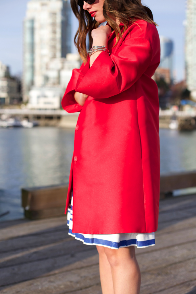 love this dress! and love how your paired it with the red coat. you can never go wrong with blue stripes and red. also can NOT wait till its warm enough here to go tights free!