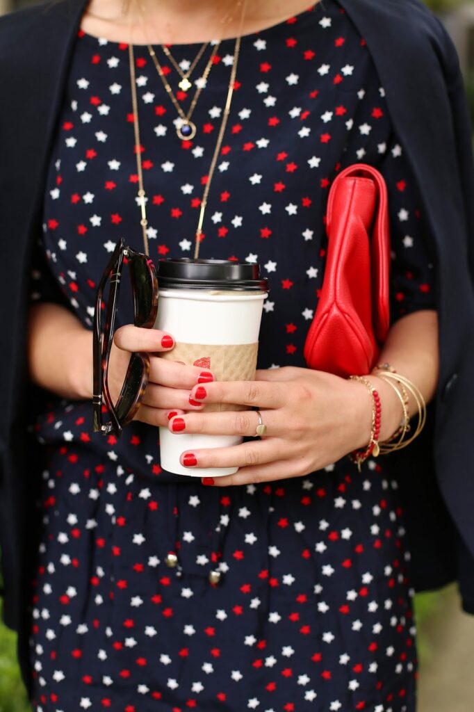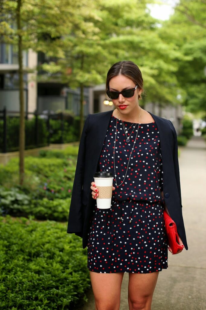 How cute is this dress?! I was recently introduced to the Australian brand Chip Chop! and instantly fell in love with their latest Parisian-inspired line – love the playful take on classic French chic! This star-adorned dress immediately caught my eye. Since it’s got such a lovely eye-catching print, I knew I wanted to keep the rest of the styling classic – just a sleek collarless silk blazer, strappy heels and a pop of red on my bag, nails and lips!