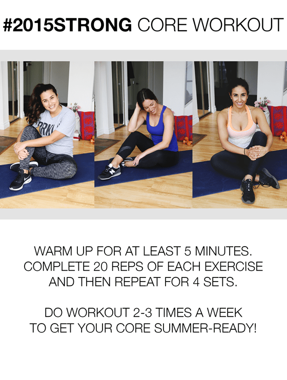 Happy hump day everyone! I am particularly ecstatic because I finally am feeling better after the worst cold of my life last week and have been back in the swing of things with our #2015STRONG program – in fact, I did the arms workout from last week a couple days ago and I’m still feeling it! Having said that, I’m so excited to be here today with a workout that we’ve been asked repeatedly for: a targeted core workout! Watch the vid below and then be sure to click through to find out how you can get a printable PDF of the workout sent straight to your inbox!