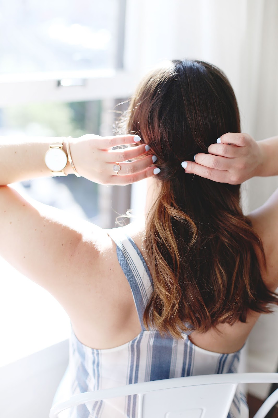 If you guys can’t tell already by now, I love anything that will double task or take me from morning to evening (whether it’s a perfect long-lasting beauty look, an #ootd that transitions easily post-work, etc). Naturally, the same low-key attitude extends to my hair. This day-to-night hairstyle only requires a few tweaks to go from desk to drinks and best of all, it’s beyond easy!