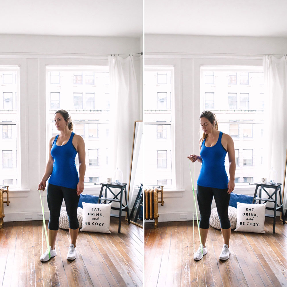 Loop your heavier resistance band around your right foot and stand in a split stance, hinging at hips and engaging your core. Keep shoulders down and keeping your arm close to your body, pull in and gently squeeze shoulder blades together! Repeat on other arm.