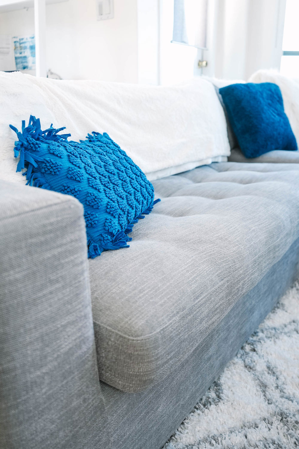 One of the easiest ways to completely change your space! I’ve been really vibing with a cobalt blue-amber combo ever since I started learning acrylic paint – I did this one admittedly not amazing but also not terrible painting while I was learning knife technique and I so loved the colour combo together that it actually served as my inspo for the whole space. I knew I wanted texture and warmth, but with my tonal leanings cobalt blue actually felt like such a great addition for fall since it actually has some warmth to it and pairs so well with cream, amber, rose and all the other colours I was really feeling. I added in some texture via a fleece cover and this Mexican lumbar pillow and all I had to do was swap out the old covers for the new! Instant room facelift!