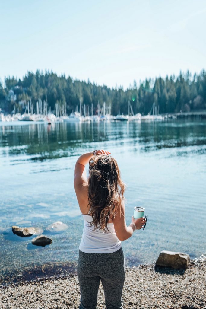 Peak summited, views enjoyed and descent done, I changed into these cozy but super chic sweats for a stop at my favourite donut shop Honey’s (a must when you’re in Deep Cove) for my go-to chocolate donut and flat white before soaking in a bit more of this gorgeous sunshine at the beach at the base of the mountain. Side note: could we get any luckier in Vancouver? The mountains, the ocean, the forest—literally everything I need to be happy.